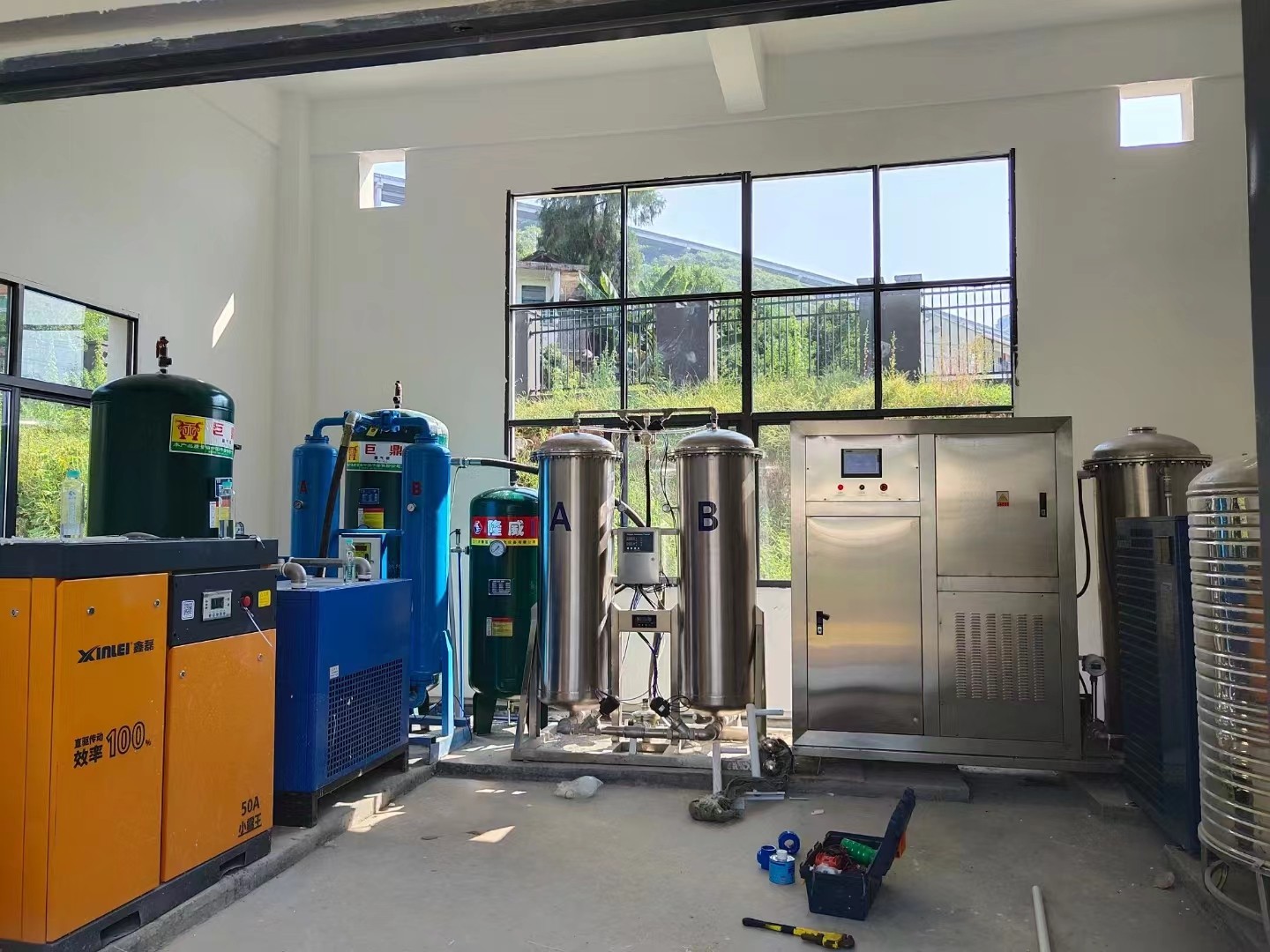 案例:廣州佳環(huán)3KG氧氣源臭氧發(fā)生器安裝調(diào)試中,該設(shè)備用貴州遵義某酒廠污水處理消毒。整套設(shè)備含3KG臭氧機(jī),制氧機(jī),螺桿空壓機(jī),冷凍式干燥機(jī),吸附干燥機(jī),儲氣罐,冷水機(jī),循環(huán)水罐,水泵等。整套設(shè)備采用PLC(西門子)控制系統(tǒng)控制。
