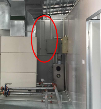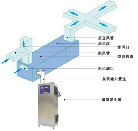 機(jī)器放置在房間外,在中央空調(diào)排風(fēng)管的送風(fēng)口處開(kāi)一個(gè)小孔,臭氧氣體從小孔通入排風(fēng)管,然后經(jīng)過(guò)每個(gè)房間的風(fēng)口均勻分布到每個(gè)房間中。