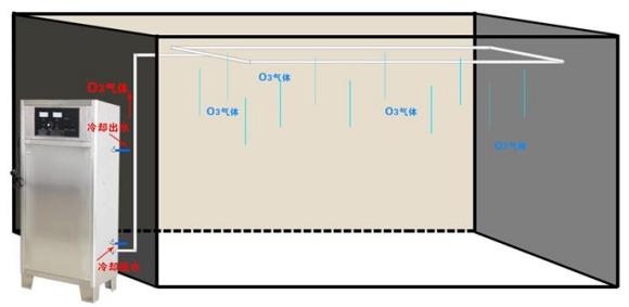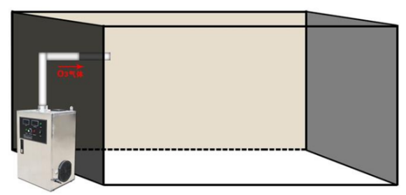 機(jī)器放置在房間外,在墻上打一個(gè)孔,利用硅膠管將臭氧氣體通入房間中。