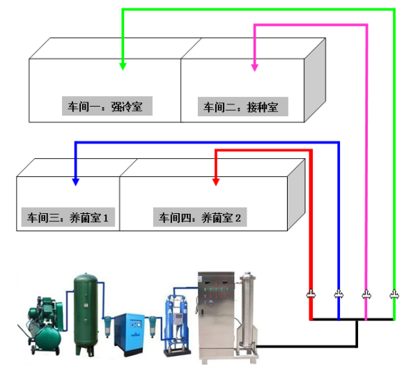 機(jī)器放置在房間外,在車間的頂部、側(cè)面墻體或者吊頂層上面,布置PVC/不銹鋼管,在輸送管上間隔開(kāi)小孔,臭氧氣體從小孔通入各個(gè)房間中。